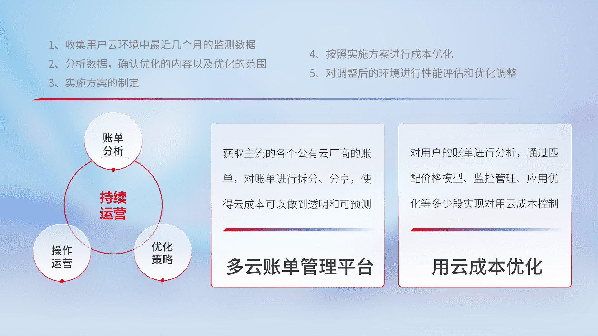 通过多云纳管,,以统一的资源数据模型把客户的云资源进行抽象和封装,,,,进而实现对多云资源的统一操作,,,保障云资源管理的可靠性、、稳定性与可用性。。。。量身定制化运维内容,,,配置、、开发运维、、补丁管理、、、、备份、、、监控、、、、认证和访问管理、、、、审计和日常巡检等,,,保障在用云过程中的可靠度,,,,稳定度以及高可用率。。